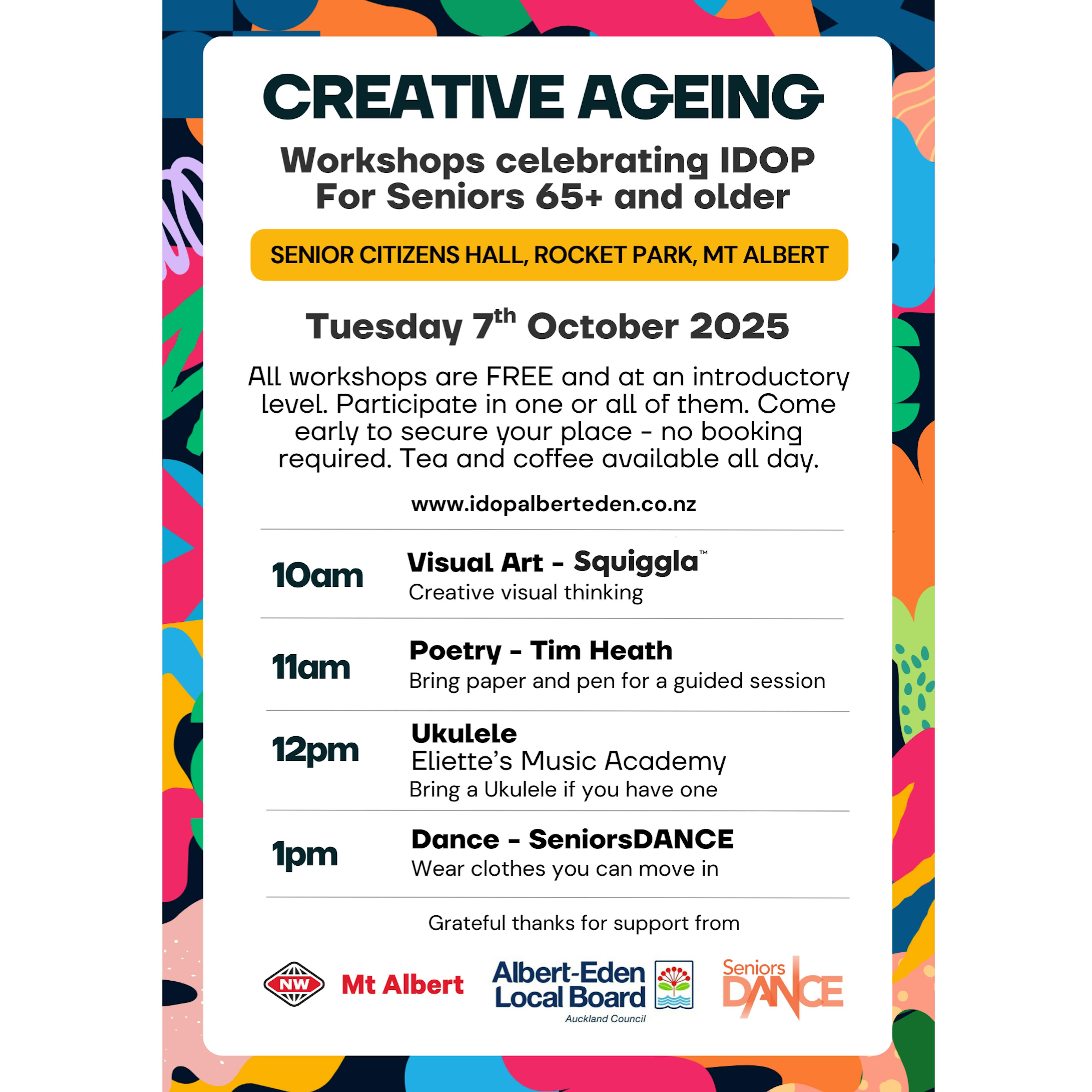IDOP Albert-Eden is a two-week celebration of older people in the community. In 2025, IDOP will be held between Wednesday 1 October to Wednesday 15th October. All events are FREE to attend. For the full programme of events, please visit the IDOP Albert-Eden website.